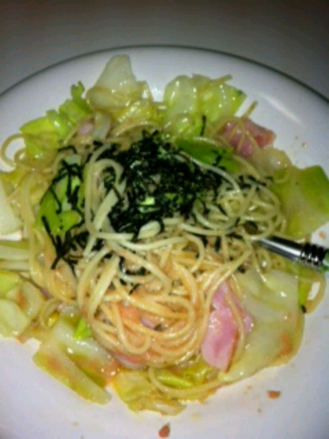 市販のたらこソースにキャベツとベーコン)^o^(